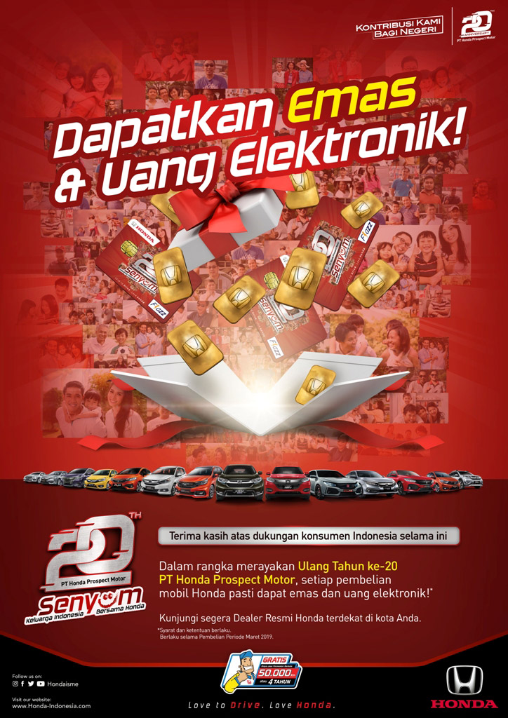 Jakarta, 6 Maret 2019 – Dalam rangka merayakan ulang tahun ke-20, PT Honda Prospect Motor (HPM) menggelar program penjualan "Honda 20th Anniversary Campaign" sepanjang bulan Maret 2019. Selama periode tersebut, setiap konsumen yang melakukan pembelian mobil Honda pasti akan mendapatkan 5 gram emas dan uang elektronik senilai Rp 1 juta.